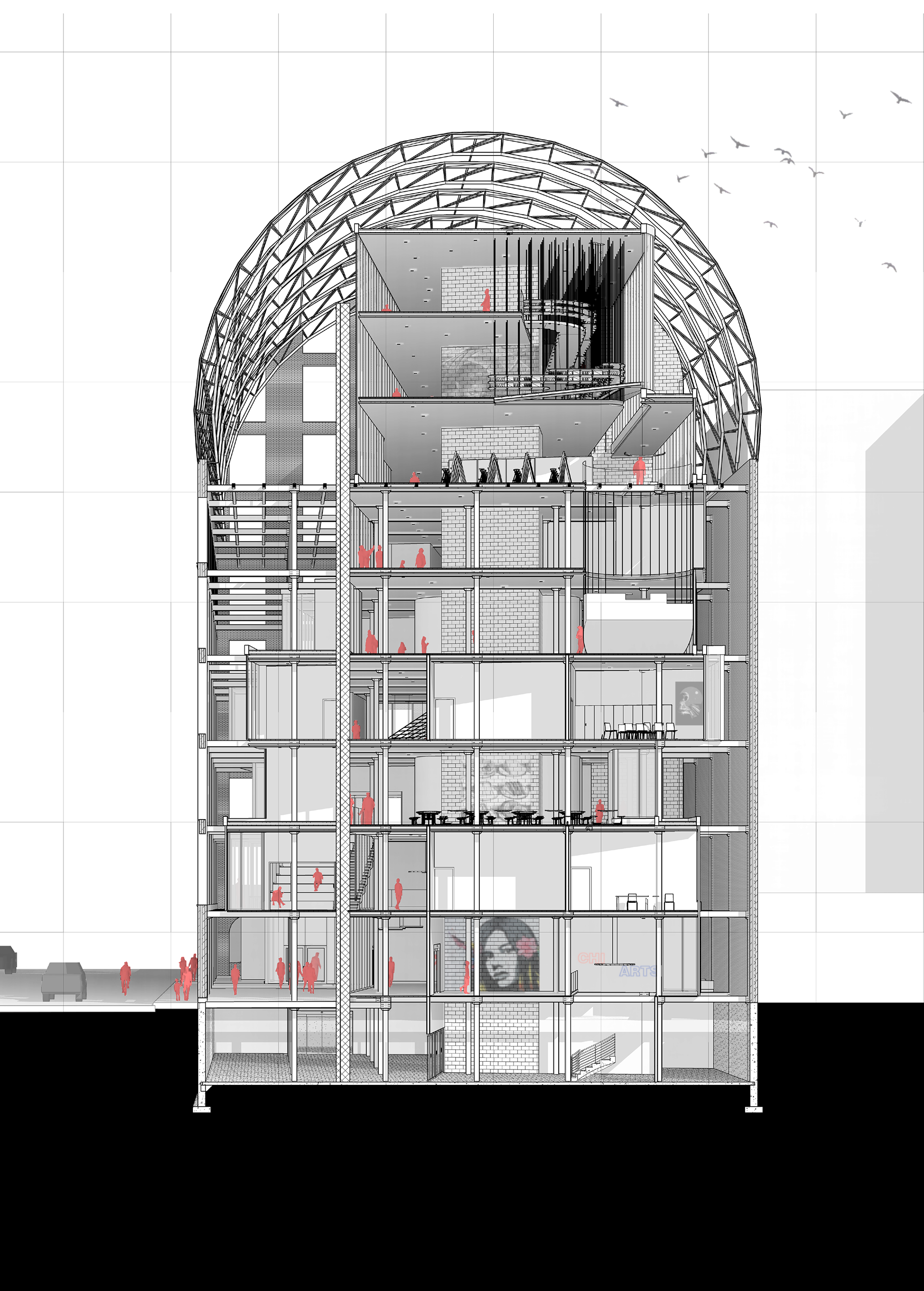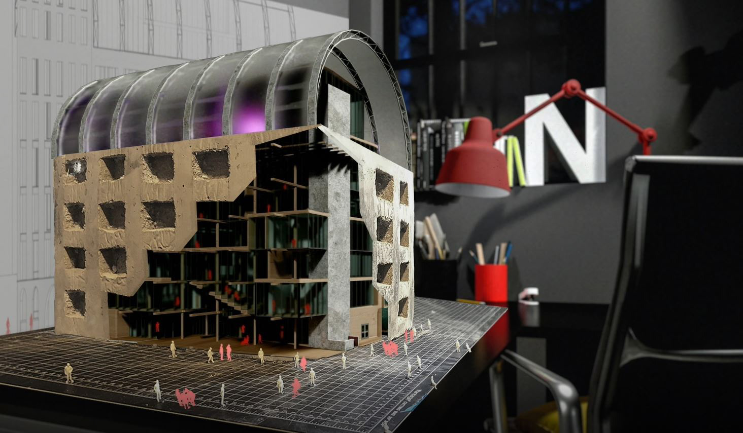 Winning digital entry for the 2021 digital studio model competition which aimed to incorporate digital and physical techniques. The animation above includes physical models like a 1/8" concrete model with 3DS Max & Corona renderings. While also using editing tools like Photoshop, After Effects, and Illustrator to compose and add to established imagery. Resulting in a final video that intends to mix and distort the viewer's ability to understand what has been physically modeled and what has been done digitally.