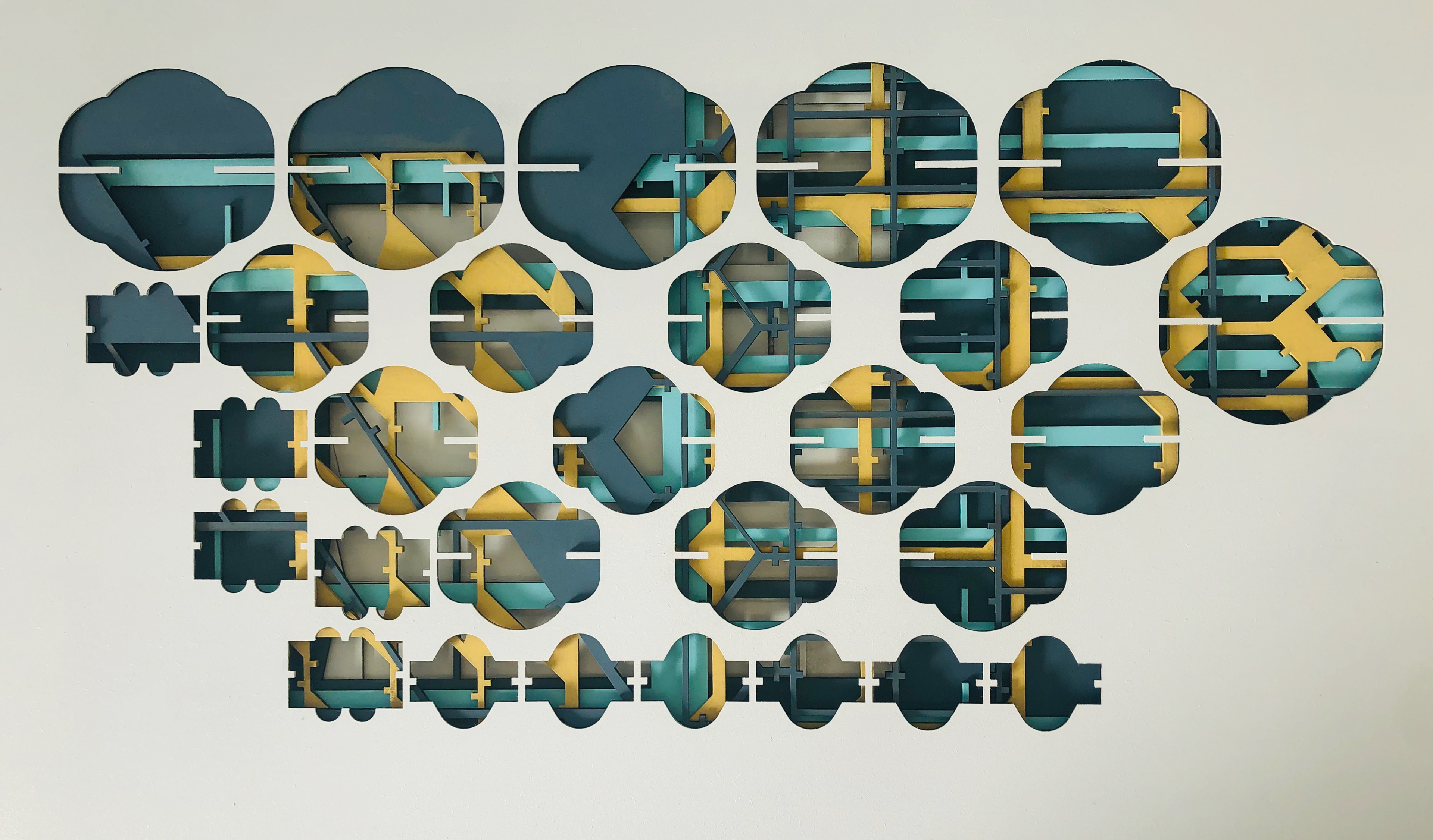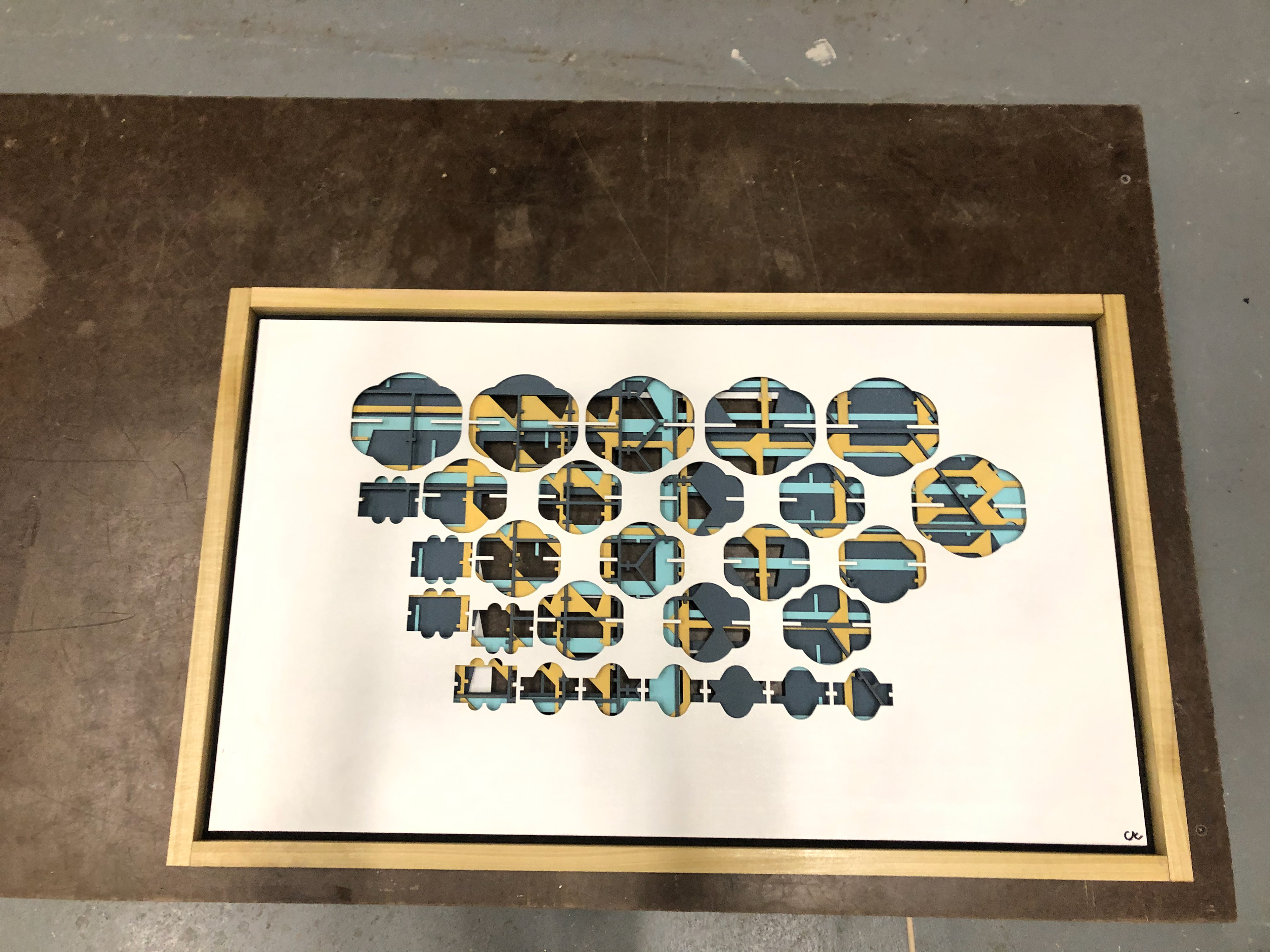 Created through the recycling of used 1/8" laser cutting sheets, through painting and layer of 9 sheets to create a distinct central pattern surrounded by an oiled popular frame.